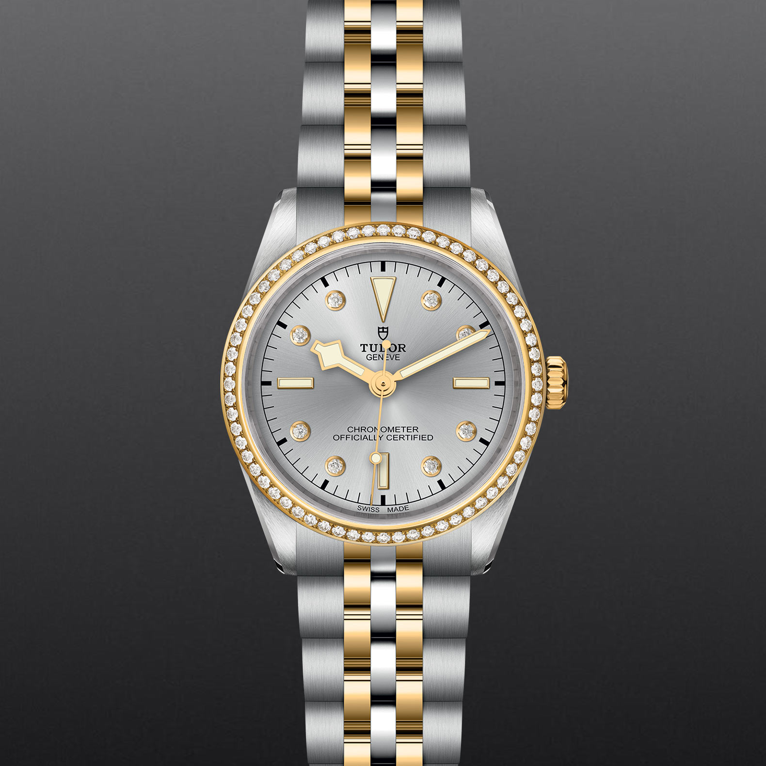 Screw-down winding crown with the TUDOR rose in relief. Steel covered by a 0.1mm 18 ct yellow gold cap