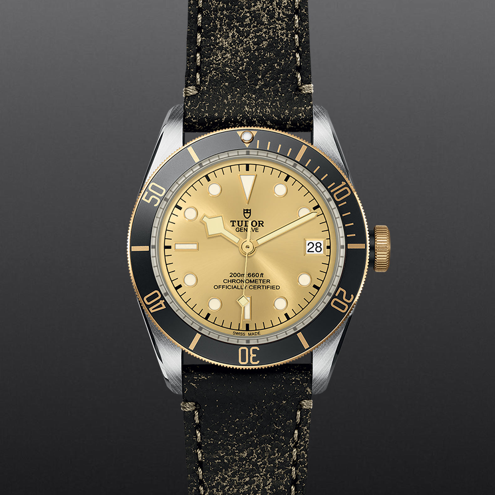 Enhancing the Black Bay with yellow gold creates a version named S&G, for Steel & Gold. Tudor derived the characteristic aesthetic elements of the Black Bay S&G model from its history. The overall shape, as well as the domed dial and crystal, come from the first Tudor divers’ watches. In this version the lines and proportions of the Black Bay are retained, while the rotating bezel and the winding crown are made from yellow gold.
