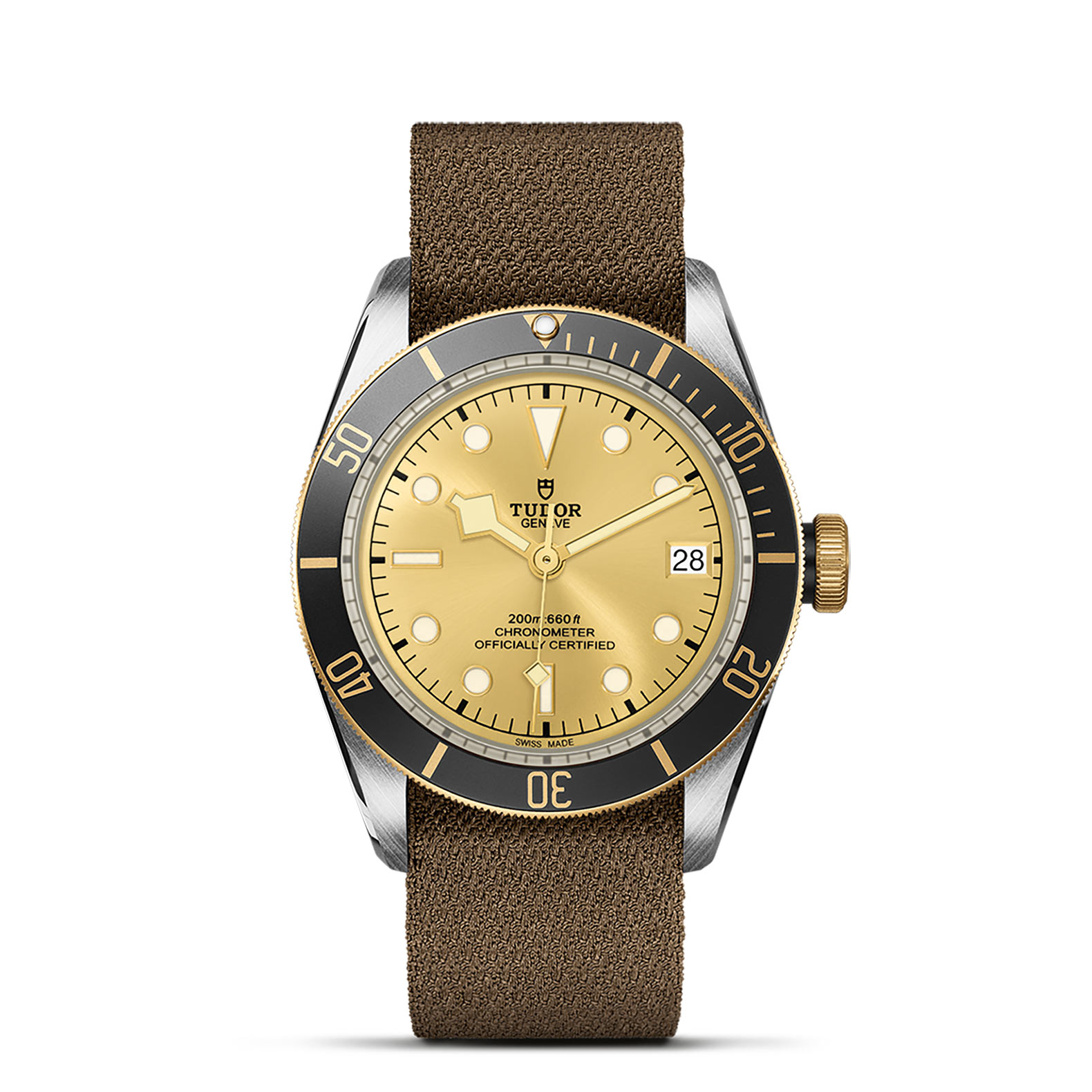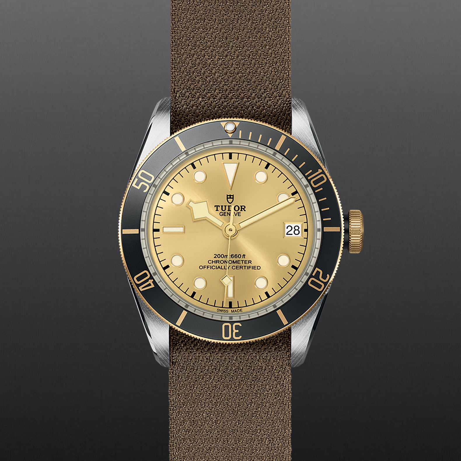 Enhancing the Black Bay with yellow gold creates a version named S&G, for Steel & Gold. Tudor derived the characteristic aesthetic elements of the Black Bay S&G model from its history. The overall shape, as well as the domed dial and crystal, come from the first Tudor divers’ watches. In this version the lines and proportions of the Black Bay are retained, while the rotating bezel and the winding crown are made from yellow gold.