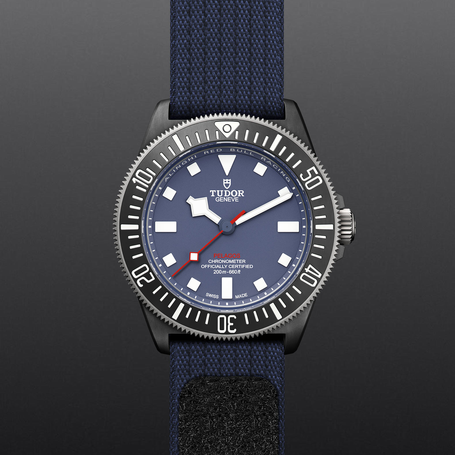 The Pelagos FXD model, where FXD refers to the extra robust fixed strap bars of the case, was developed in conjunction with the French Navy’s combat swimmers. Waterproof to 200 m (660 ft), it was designed for underwater navigation and is optimized for professional use.