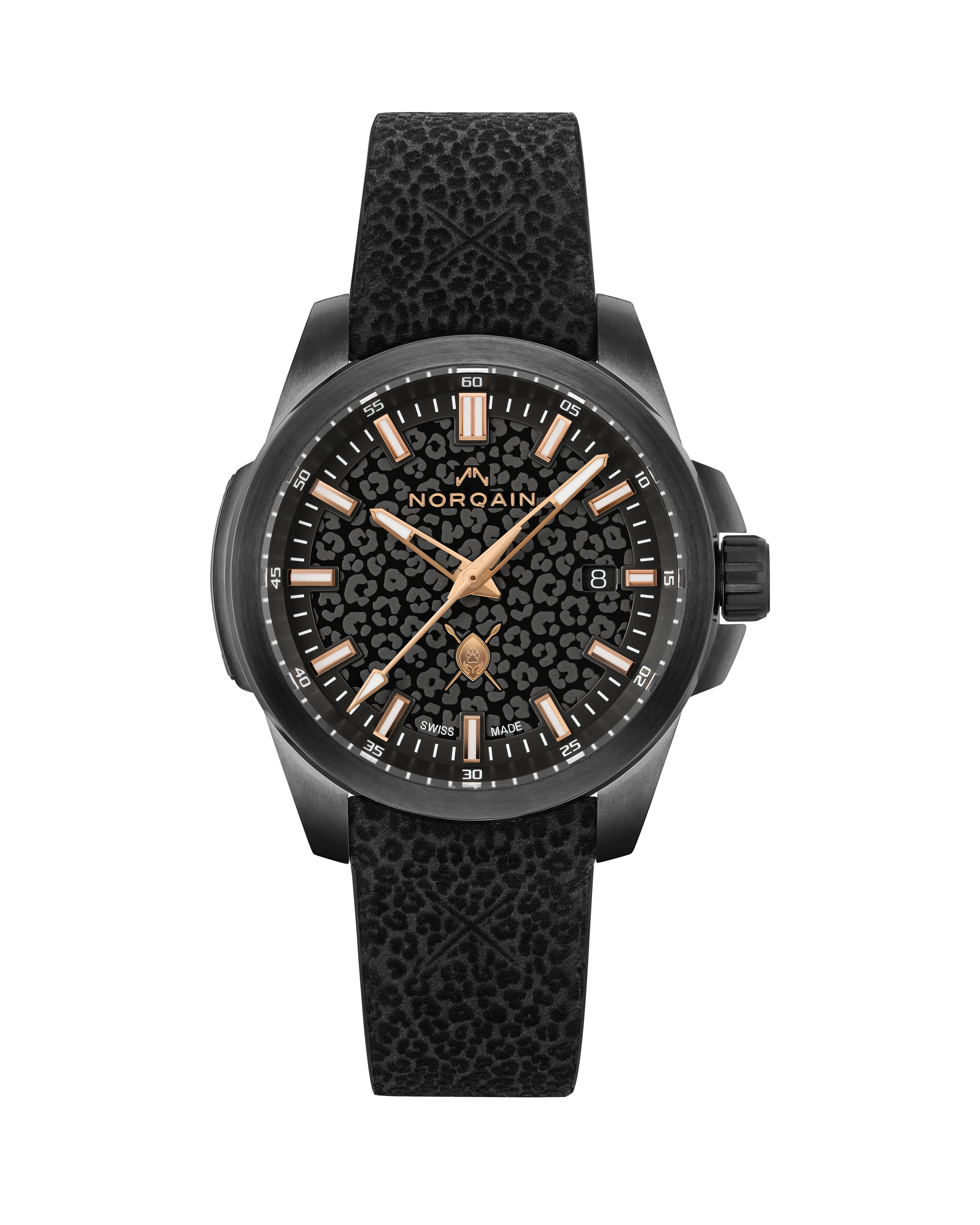 Designed in collaboration with NORQAINER and wildlife ambassador Dean Schneider, this 40mm Independence immediately turns heads with its leopard-print pattern on the black dial. 10% of the earnings of sales from this timepiece will be donated to the Hakuna Mipaka Oasis.