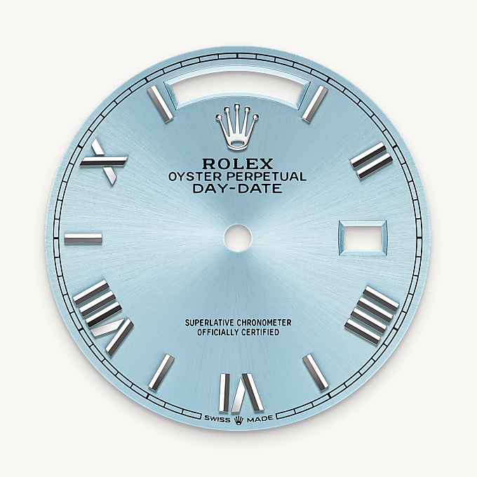 The ice-blue dial is the discreet and exclusive signature of a Rolex platinum watch. Rolex uses platinum, the noblest of metals, for the finest of watches. This exclusive dial colour can be found only on the Day-Date, the Cosmograph Daytona and the Perpetual 1908.