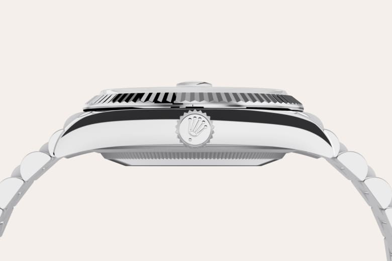 The Rolex fluted bezel is a mark of distinction. Originally, the fluting of the Oyster bezel had a functional purpose: it served to screw the bezel onto the case helping to ensure the waterproofness of the watch. It was therefore identical to the fluting on the case back, which was also screwed onto the case for waterproofness, using specific Rolex tools. Over time, the fluting became an aesthetic element, a genuine Rolex signature feature. Today the fluted bezel is a mark of distinction, in platinum on this Day-Date 36.