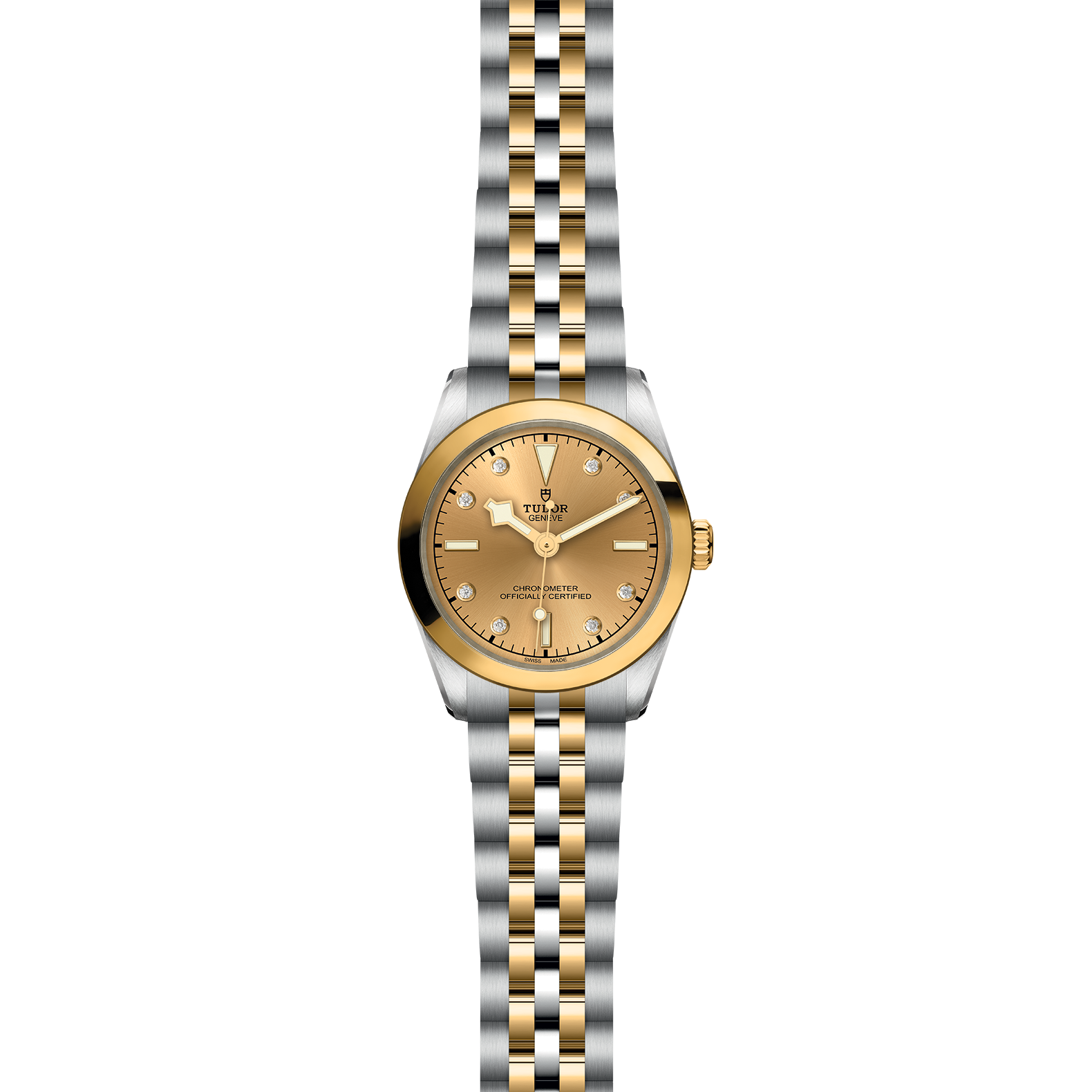 Screw-down winding crown with the TUDOR rose in relief. Steel covered by a 0.1mm yellow gold cap