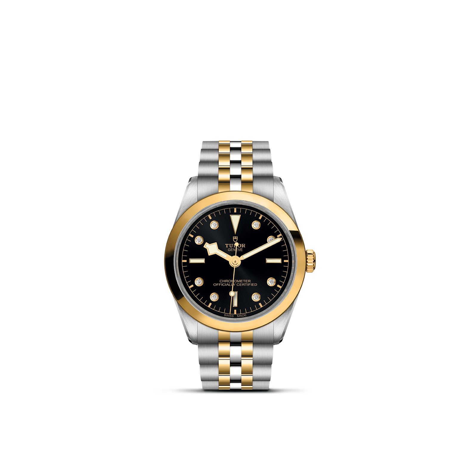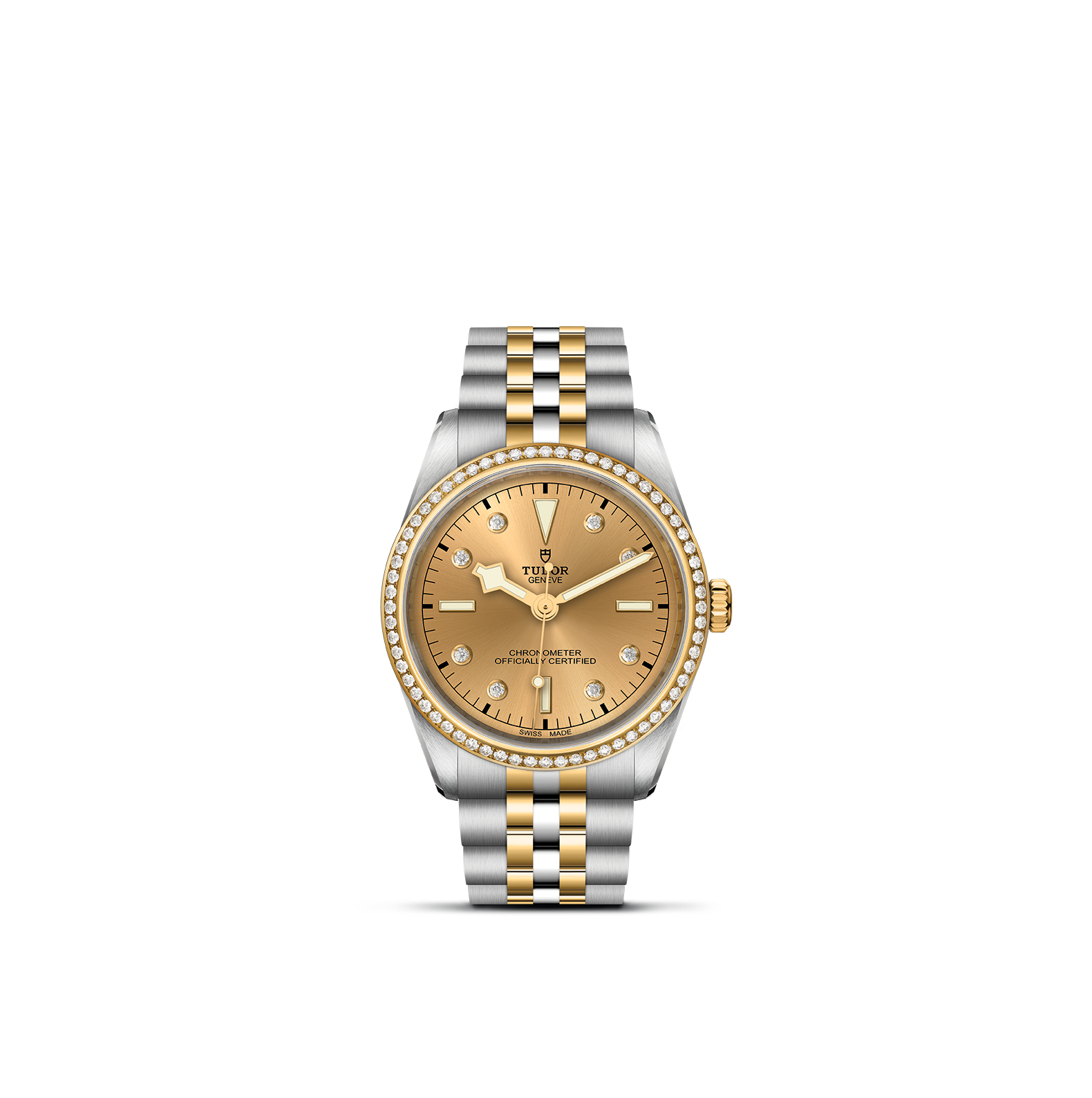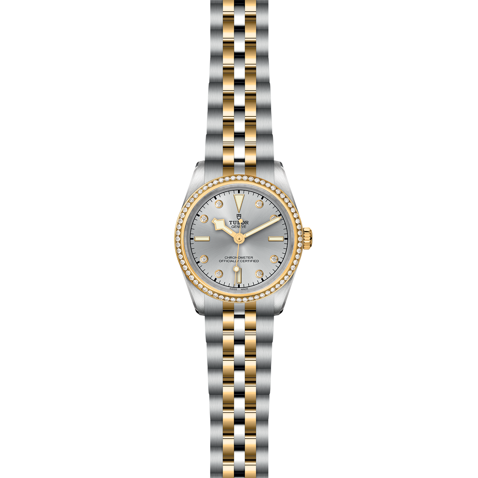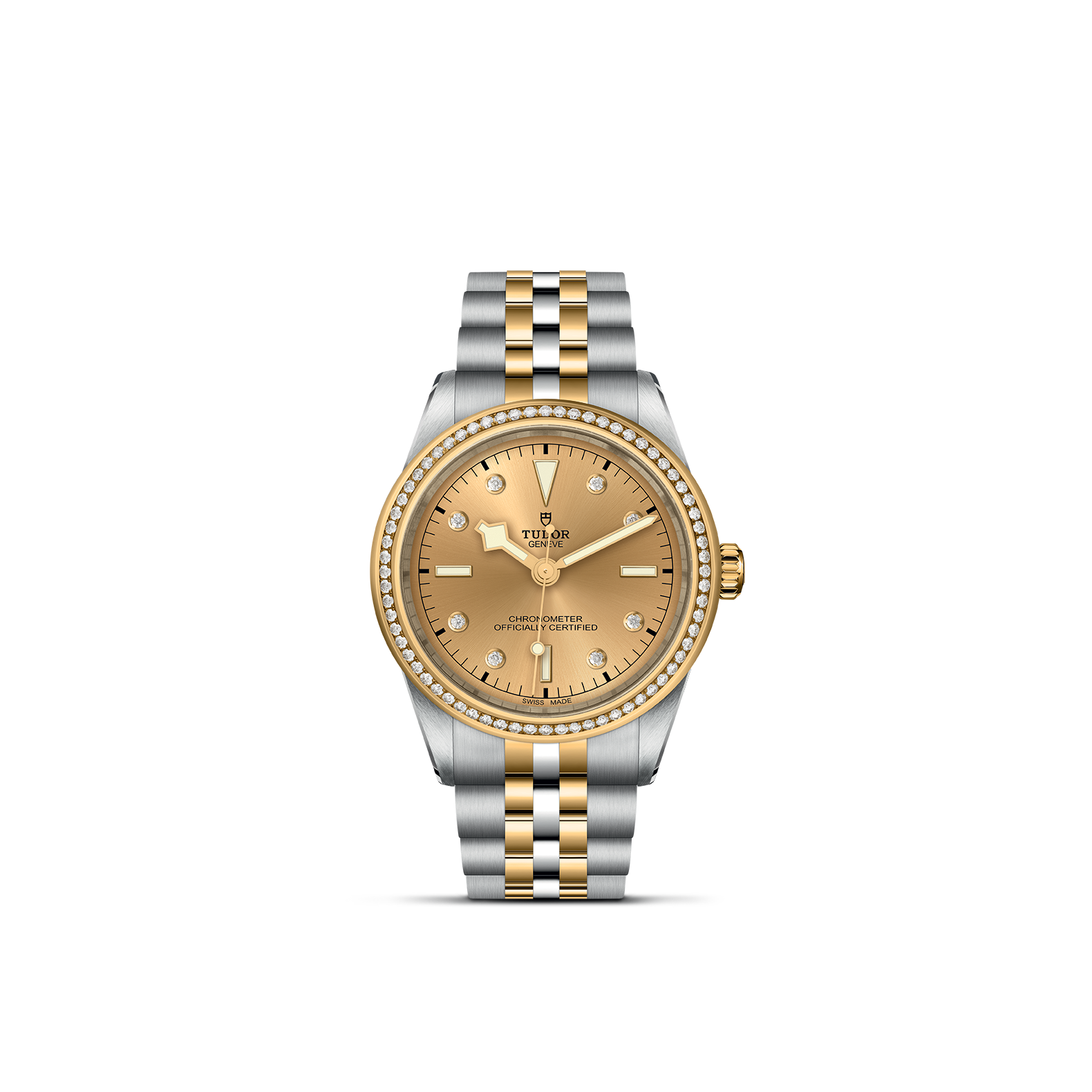 Screw-down winding crown with the TUDOR rose in relief. Steel covered by a 0.1mm yellow gold cap