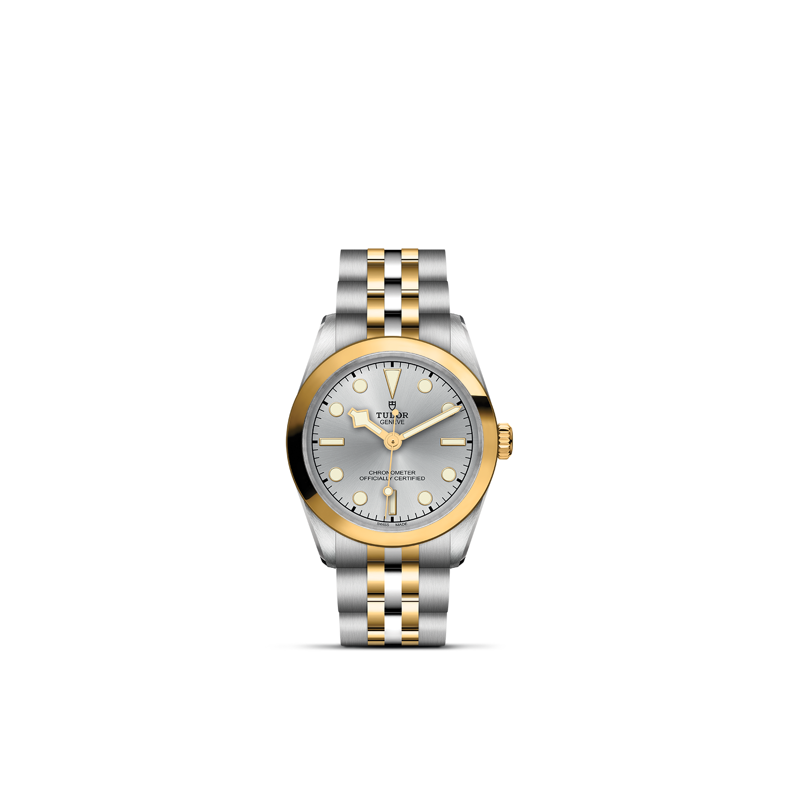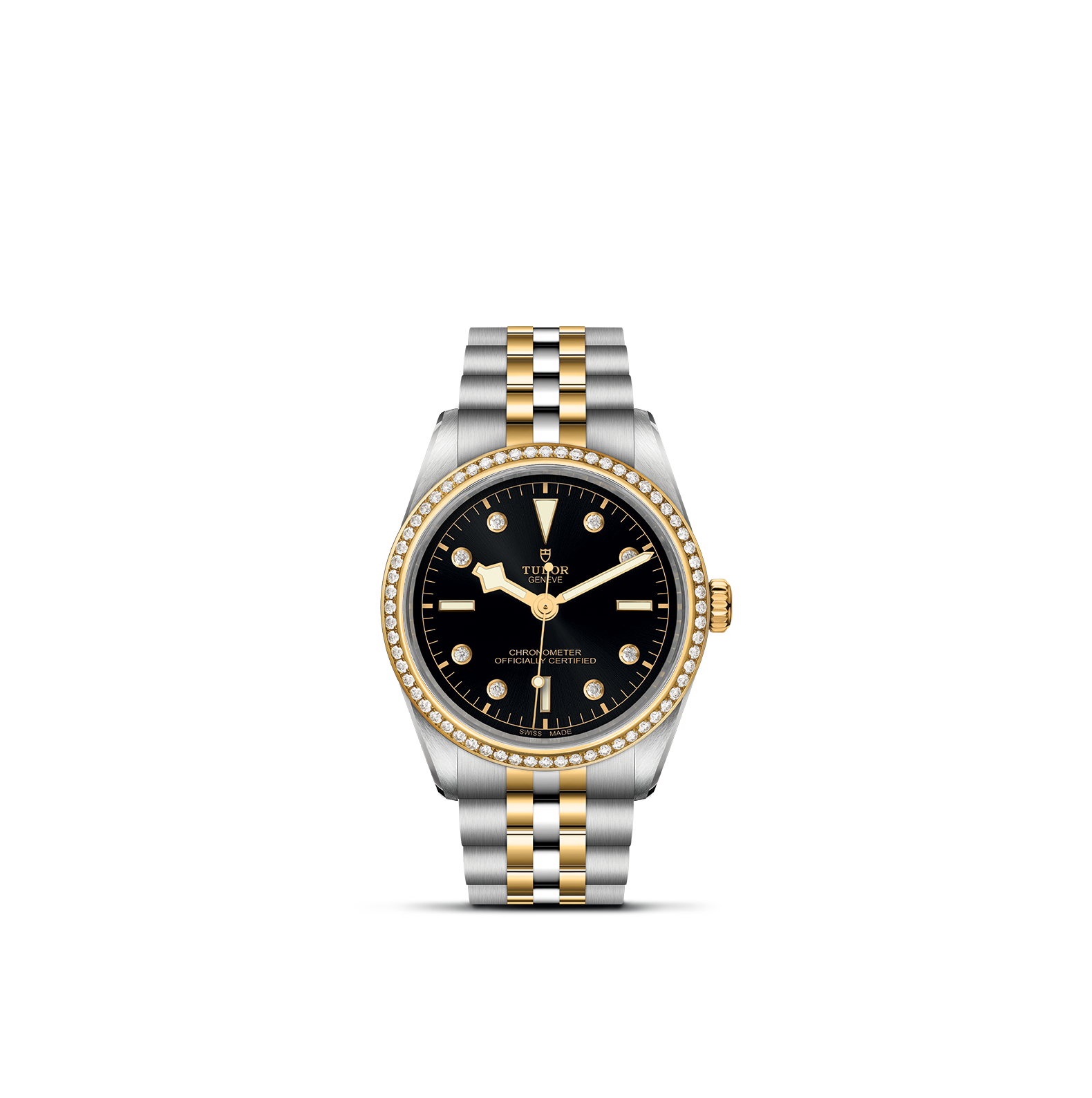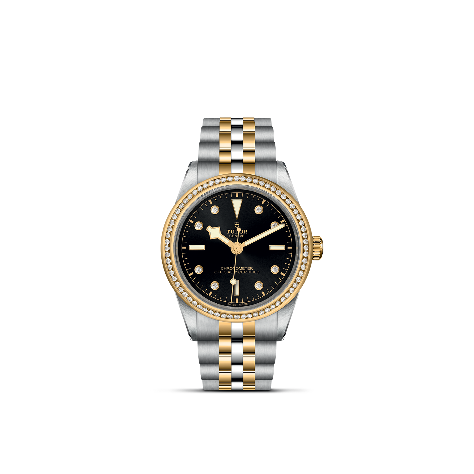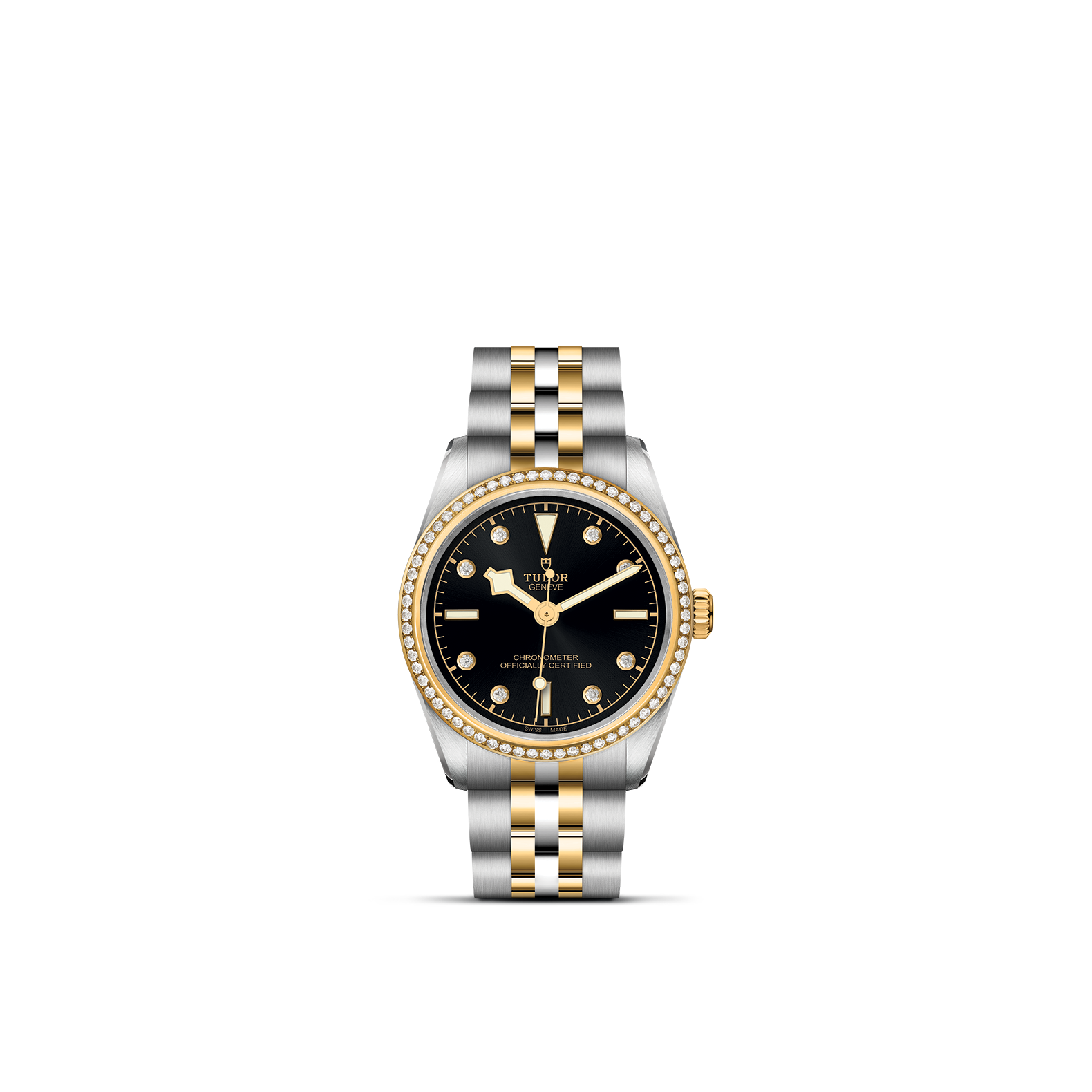 Screw-down winding crown with the TUDOR rose in relief. Steel covered by a 0.1mm yellow gold cap