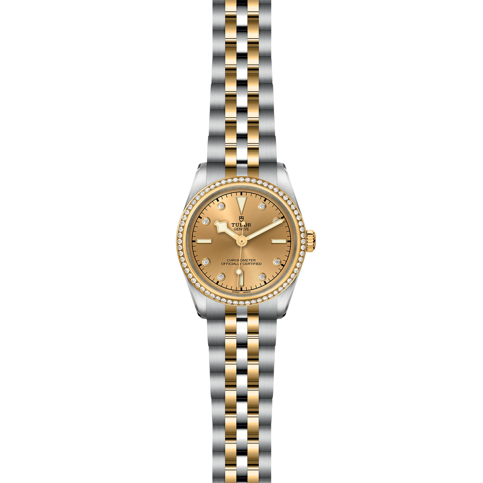 Screw-down winding crown with the TUDOR rose in relief. Steel covered by a 0.1mm yellow gold cap