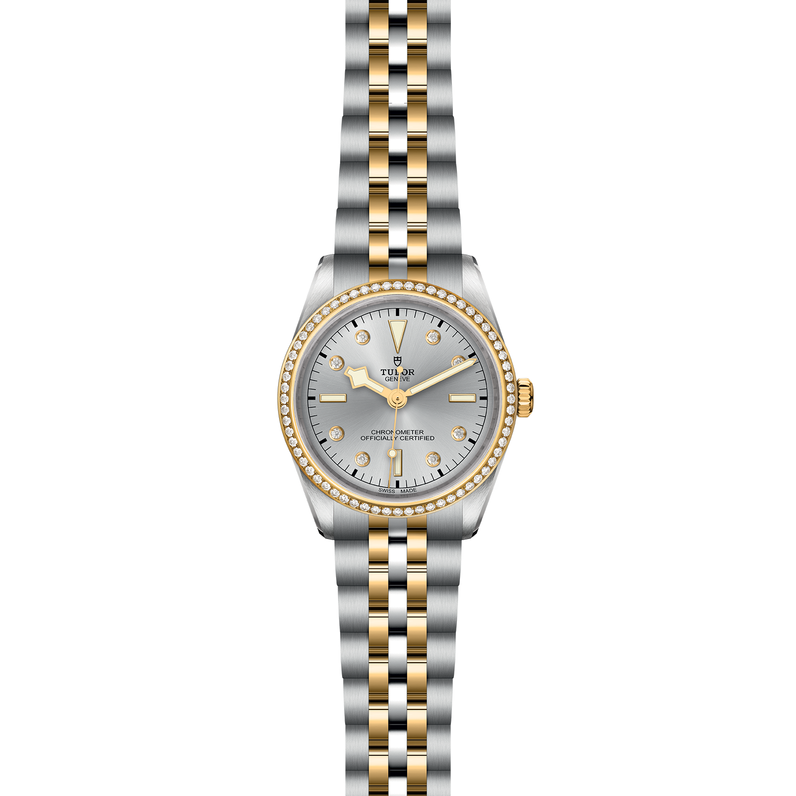 Screw-down winding crown with the TUDOR rose in relief. Steel covered by a 0.1mm yellow gold cap