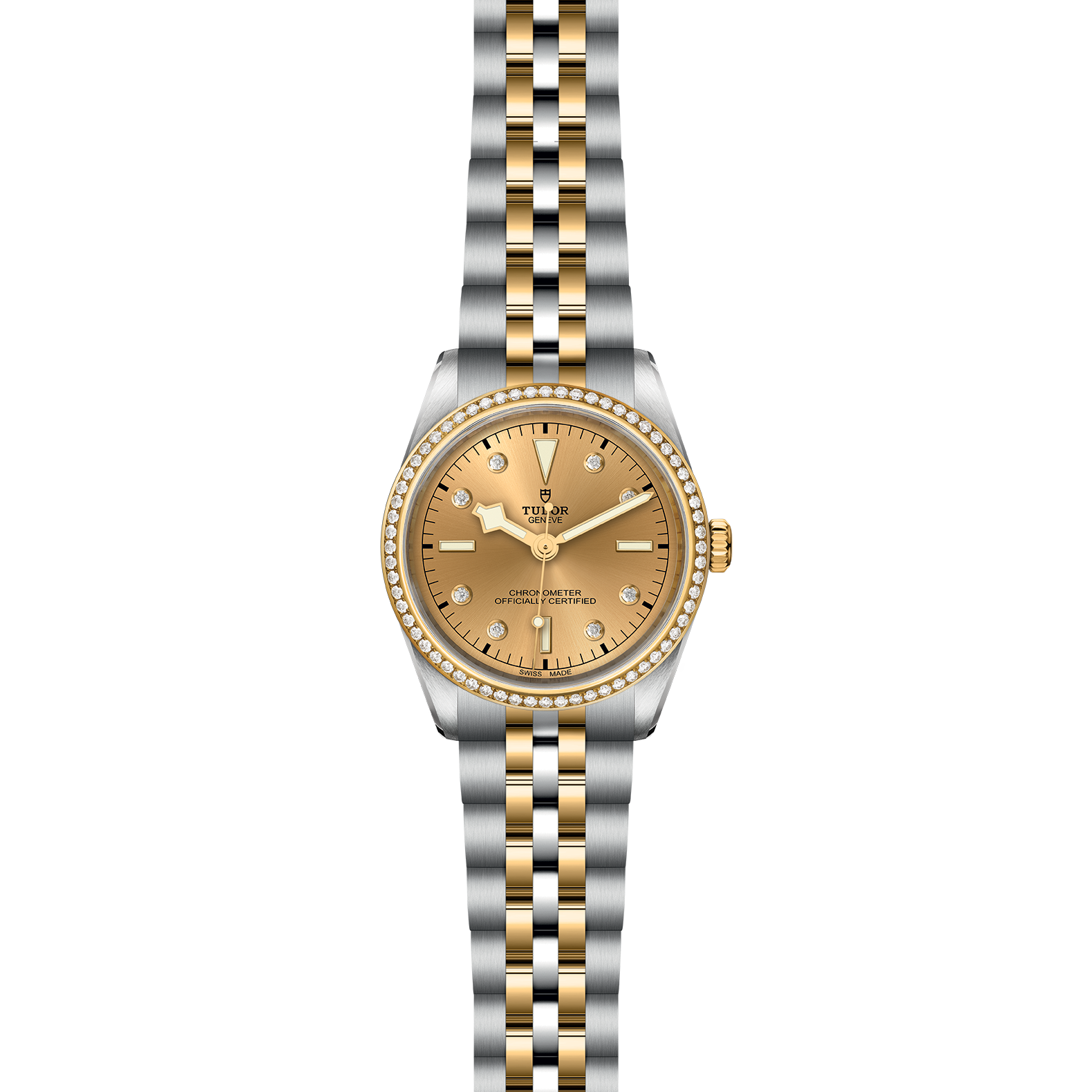 Screw-down winding crown with the TUDOR rose in relief. Steel covered by a 0.1mm yellow gold cap