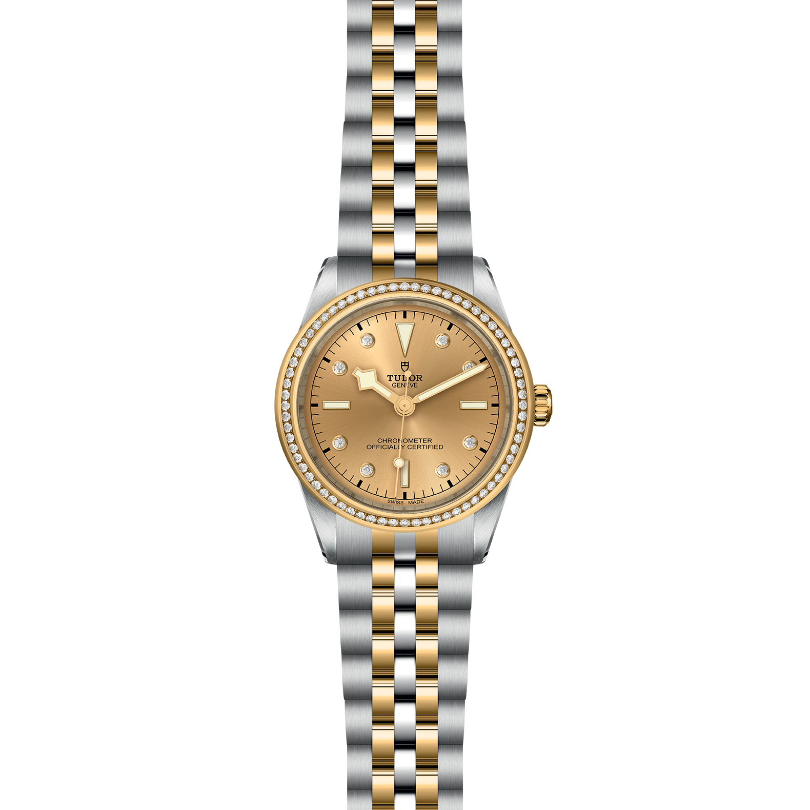 Screw-down winding crown with the TUDOR rose in relief. Steel covered by a 0.1mm yellow gold cap