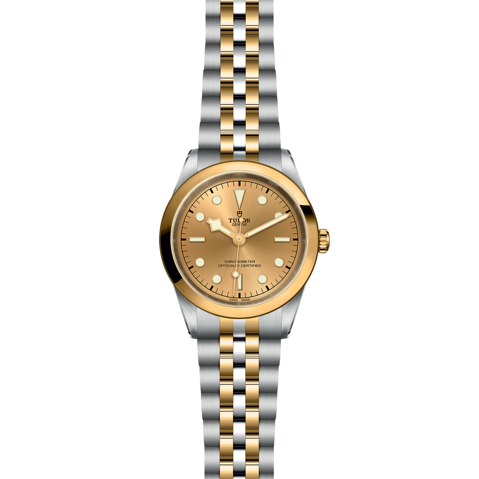 Screw-down winding crown with the TUDOR rose in relief. Steel covered by a 0.1mm yellow gold cap