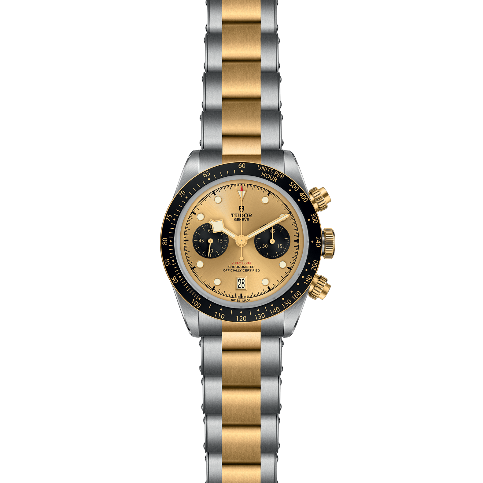 Screw-down winding crown with the TUDOR rose in relief. Solid yellow gold screw-down pushers at 2 and 4 o’clock. Steel covered by a 0.3mm yellow gold cap