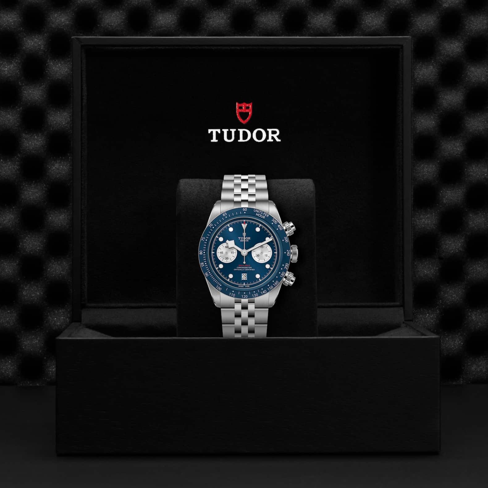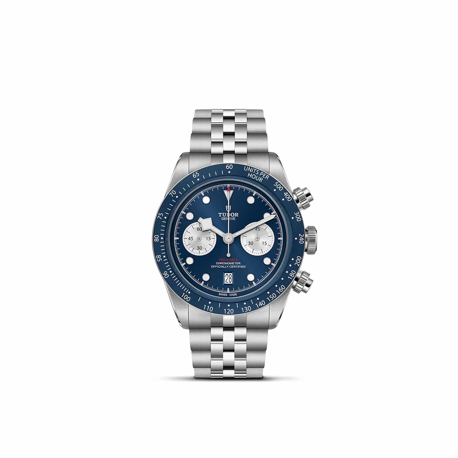 The hybrid Black Bay Chrono combines the heritage of divers’ watches represented by the Black Bay family with the queen of the racetrack, the chronograph. The characteristics of the Black Bay collection are preserved in a steel case fitted with pushers inspired by the first generation of Tudor chronographs. A fixed bezel with an engraved tachymetric scale completes the face of this sporty chronograph.