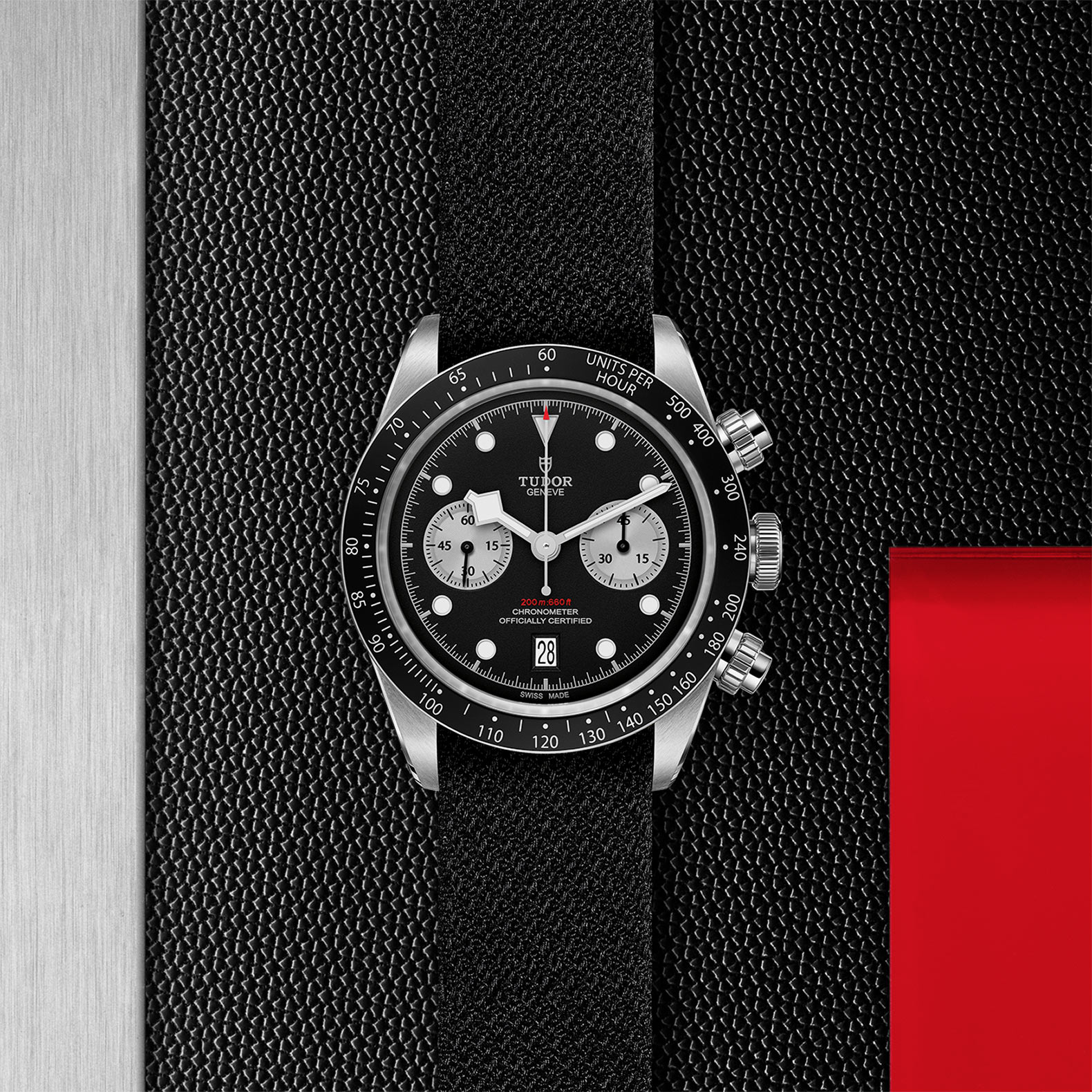 The hybrid Black Bay Chrono combines the heritage of divers’ watches represented by the Black Bay family with the queen of the racetrack, the chronograph. The characteristics of the Black Bay collection are preserved in a steel case fitted with pushers inspired by the first generation of Tudor chronographs. A fixed bezel with an engraved tachymetric scale completes the face of this sporty chronograph.