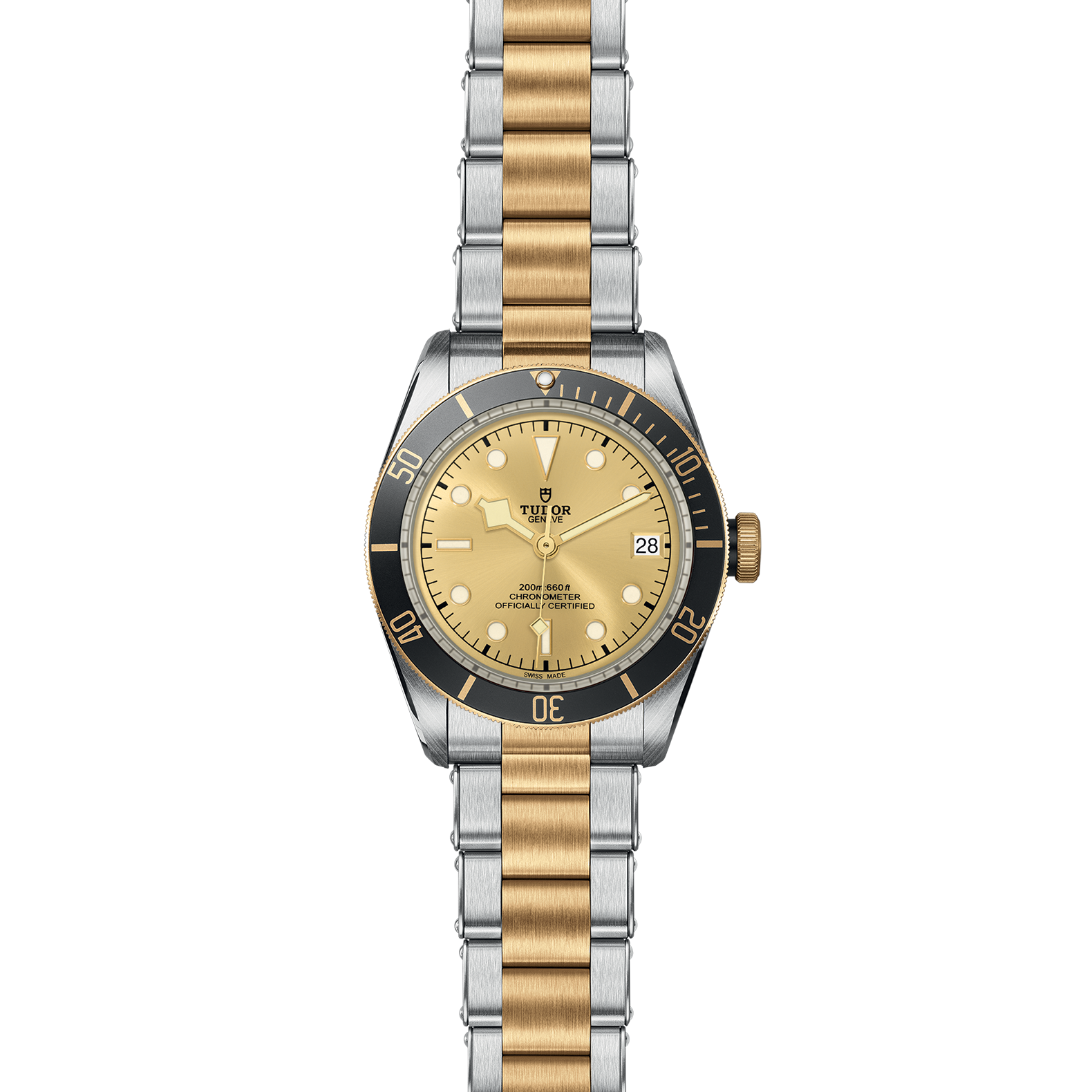 Screw-down winding crown, with the TUDOR rose engraved and lacquered in black, with black anodised aluminium winding crown tube. Steel covered by a 0.3mm yellow gold cap