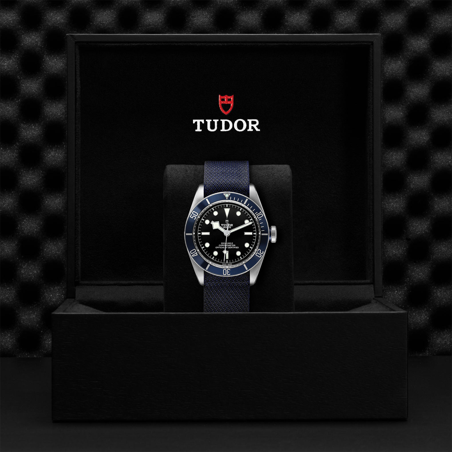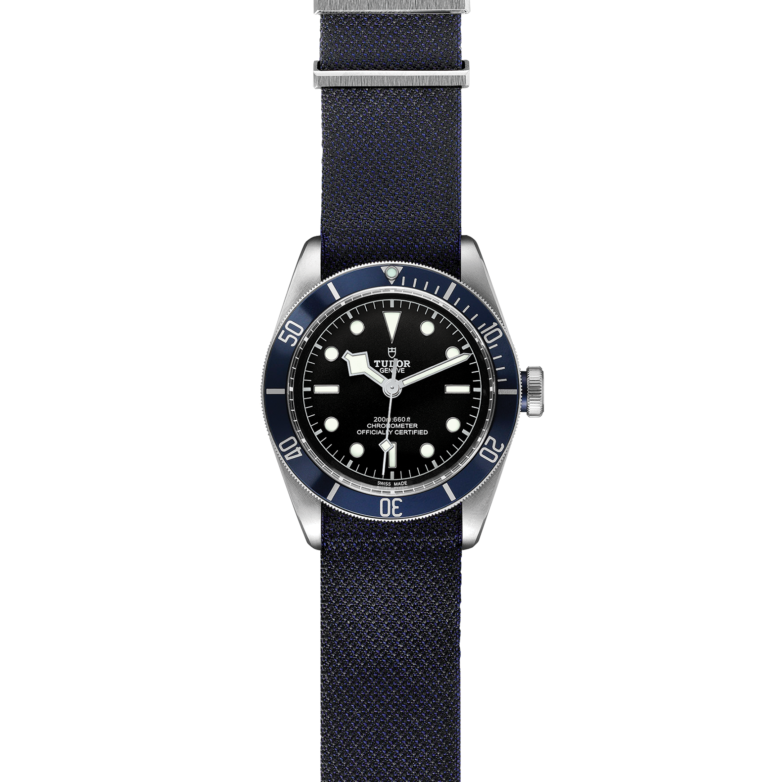 Screw-down steel winding crown, with the TUDOR rose engraved and black-lacquered, with blue anodised aluminium winding crown tube