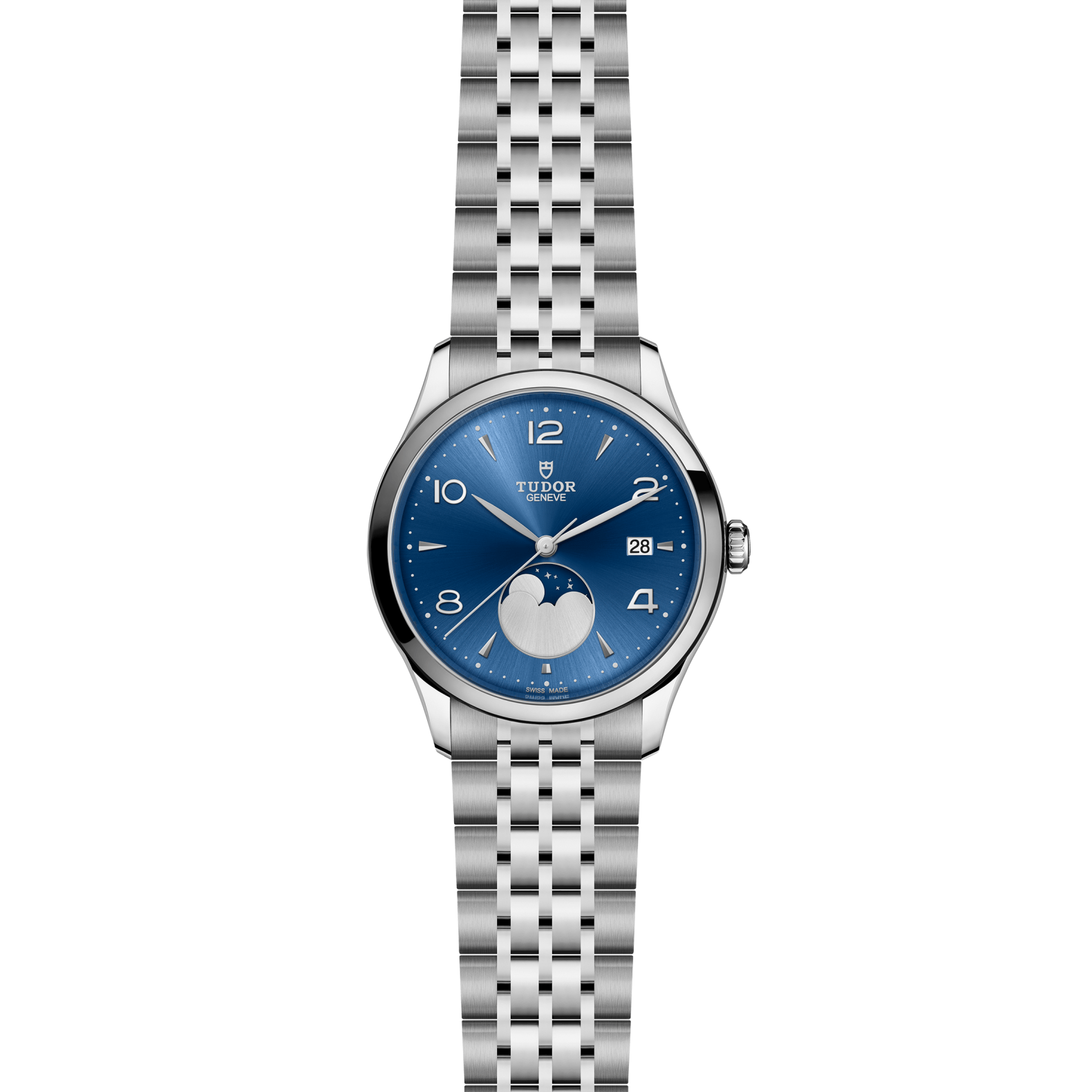 Blue satin sun-brushed dial with applied numerals and moon phase indicator