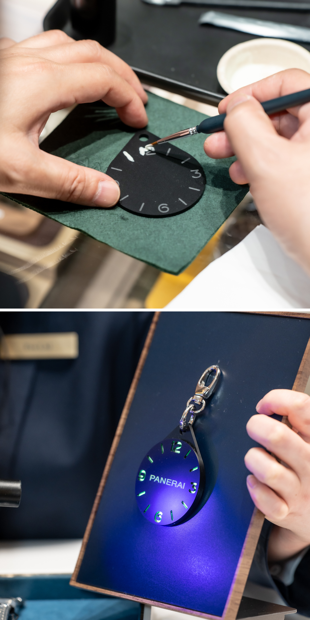 客人可亲手在阿拉伯数字及时标覆盖夜光物料,让这份纪念品在漆黑中如同真实庐米诺系列腕表一样,绽放出炫目的绿色光芒。