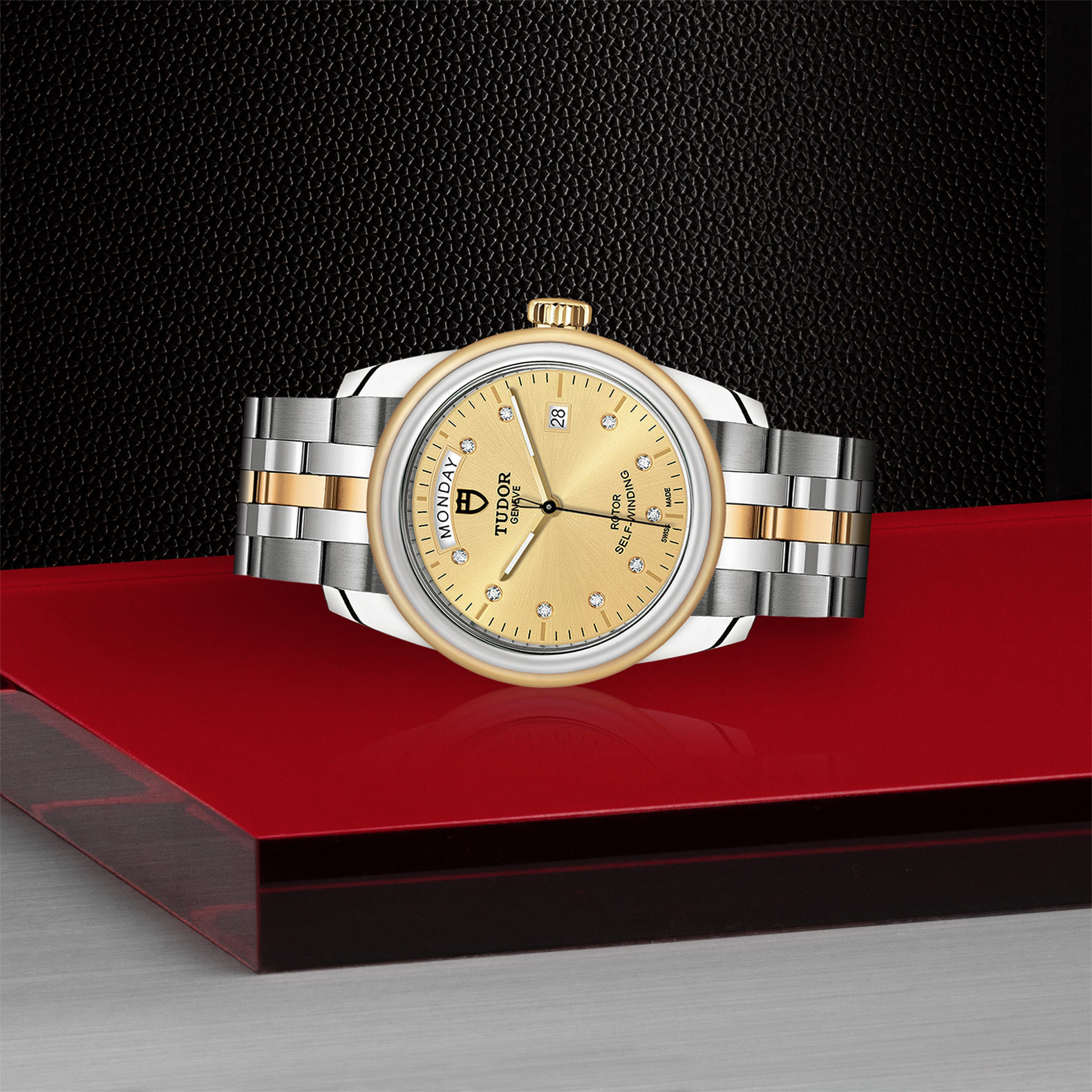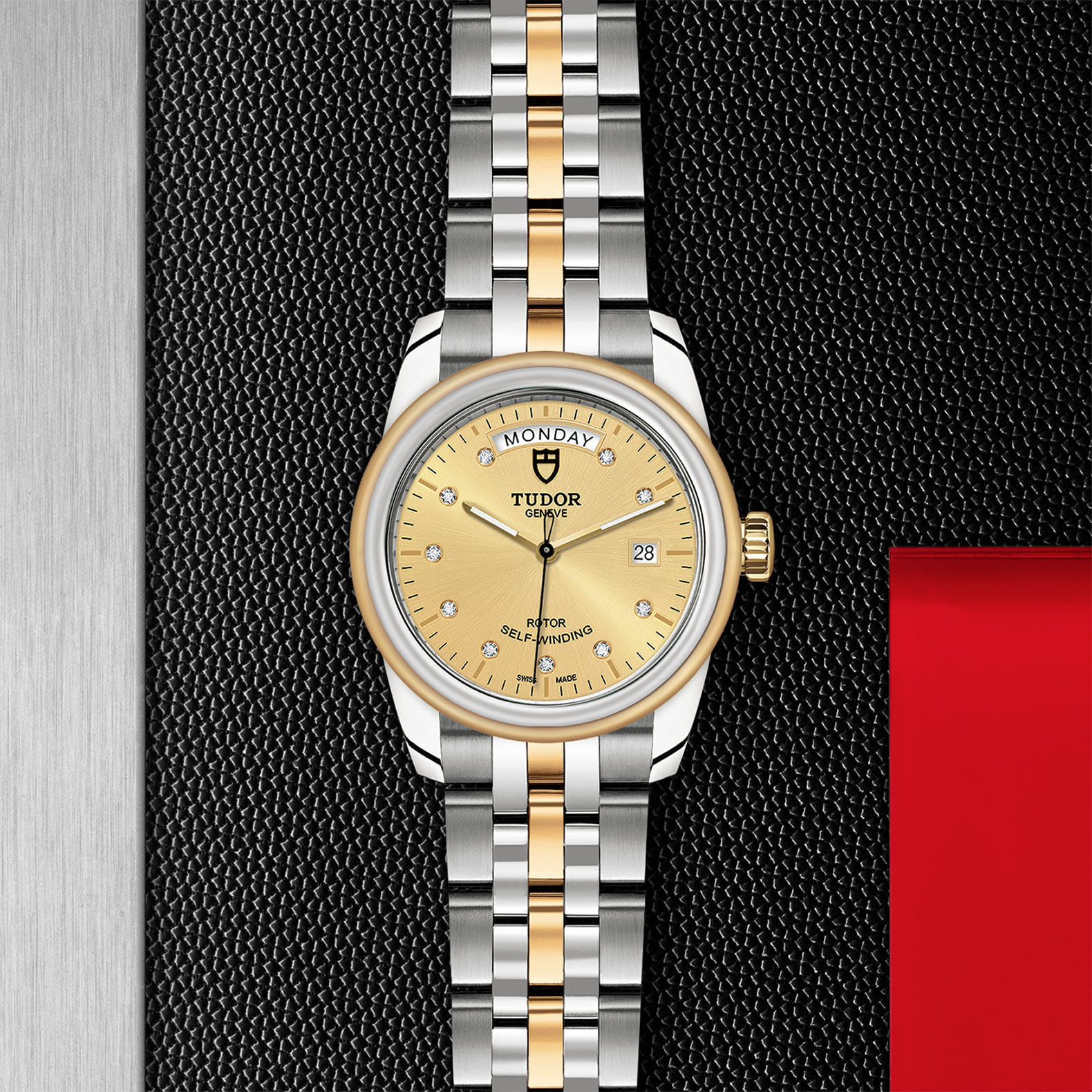 位于6点钟及12点钟位置的首节中间链节由实心黄金制成;其余中间链节由精钢或钢芯及0.2毫米黄金包金制成;摺扣及保险扣