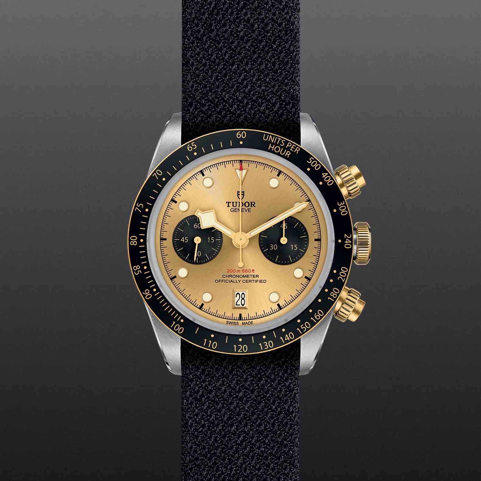 混合型Black Bay Chrono将Black Bay系列代表的潜水表传统与赛车计时表的精髓相结合。钢表壳保留了Black Bay系列的显著特征,其按钮的设计灵感则源于第一代帝舵计时腕表。圆纹磨砂钢固定外圈刻有测速计刻度,使这款运动型计时腕表的外观更趋完备。