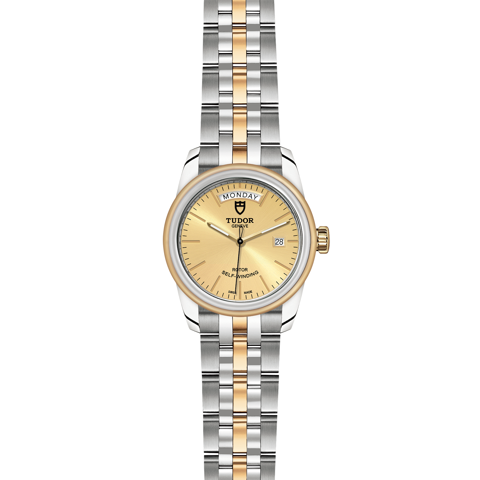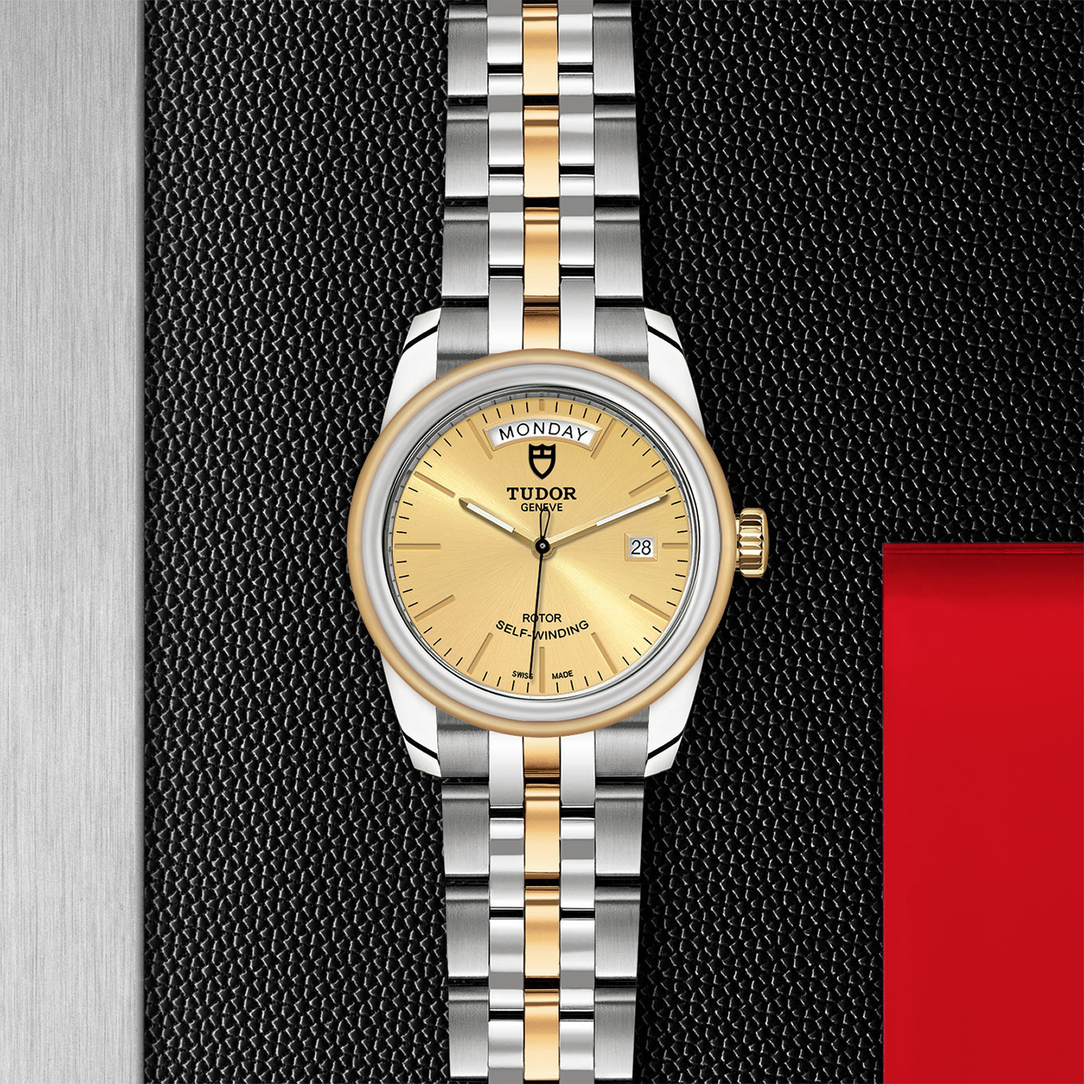 位於6點鐘及12點鐘位置的首節中間鏈節由實心黃金製成;其餘中間鏈節由精鋼或鋼芯及0.2毫米黃金包金製成;摺扣及保險扣