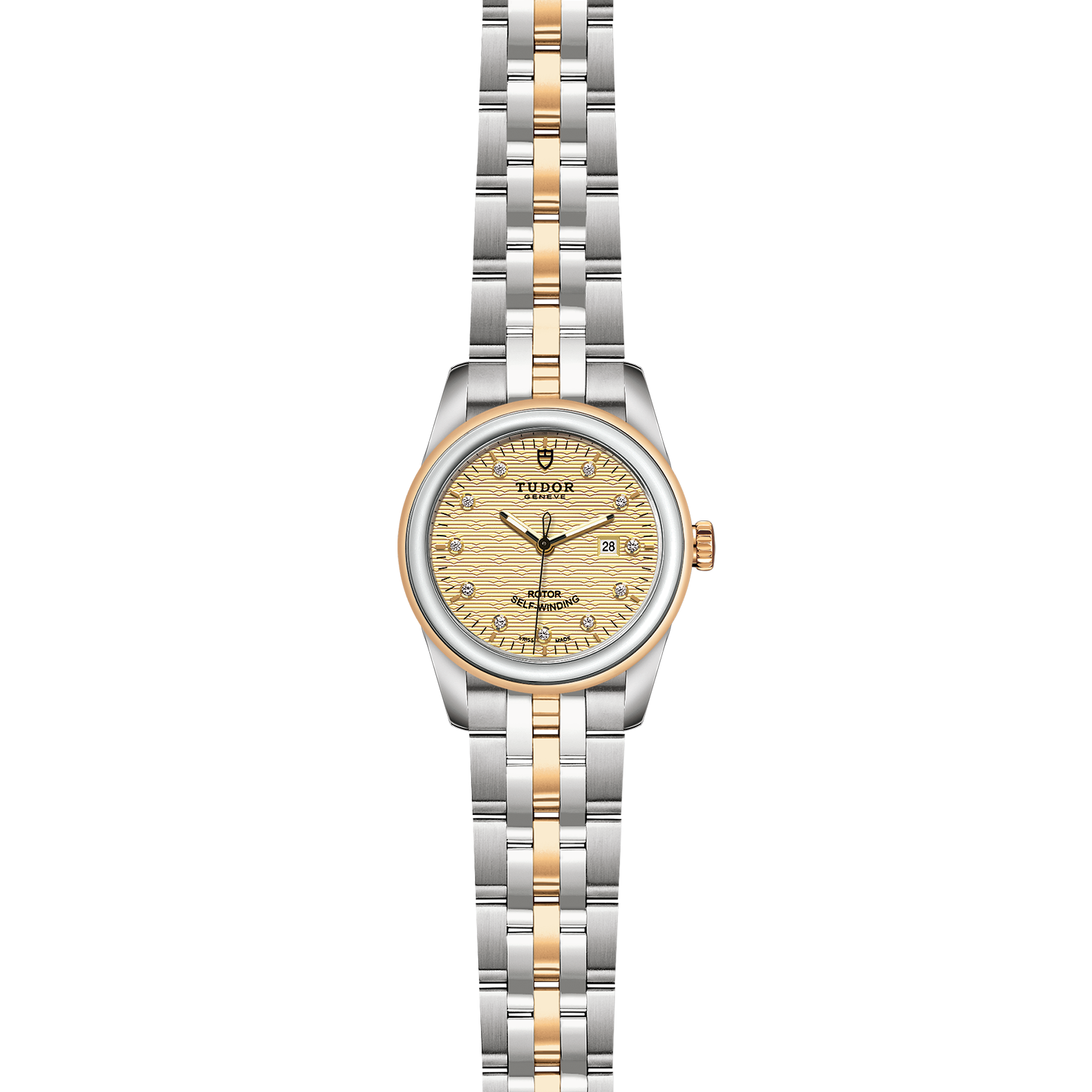 位於6點鐘及12點鐘位置的首節中間鏈節由實心黃金製成;其餘中間鏈節由精鋼或鋼芯及0.2毫米黃金包金製成;摺扣及保險扣