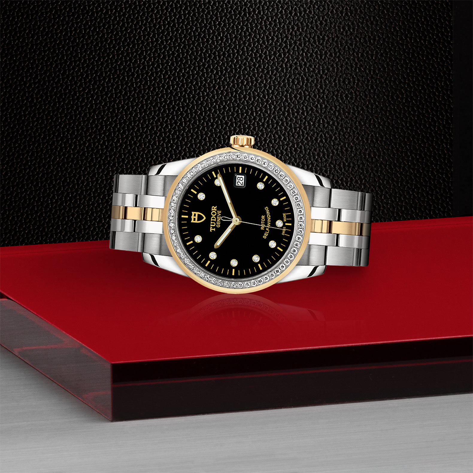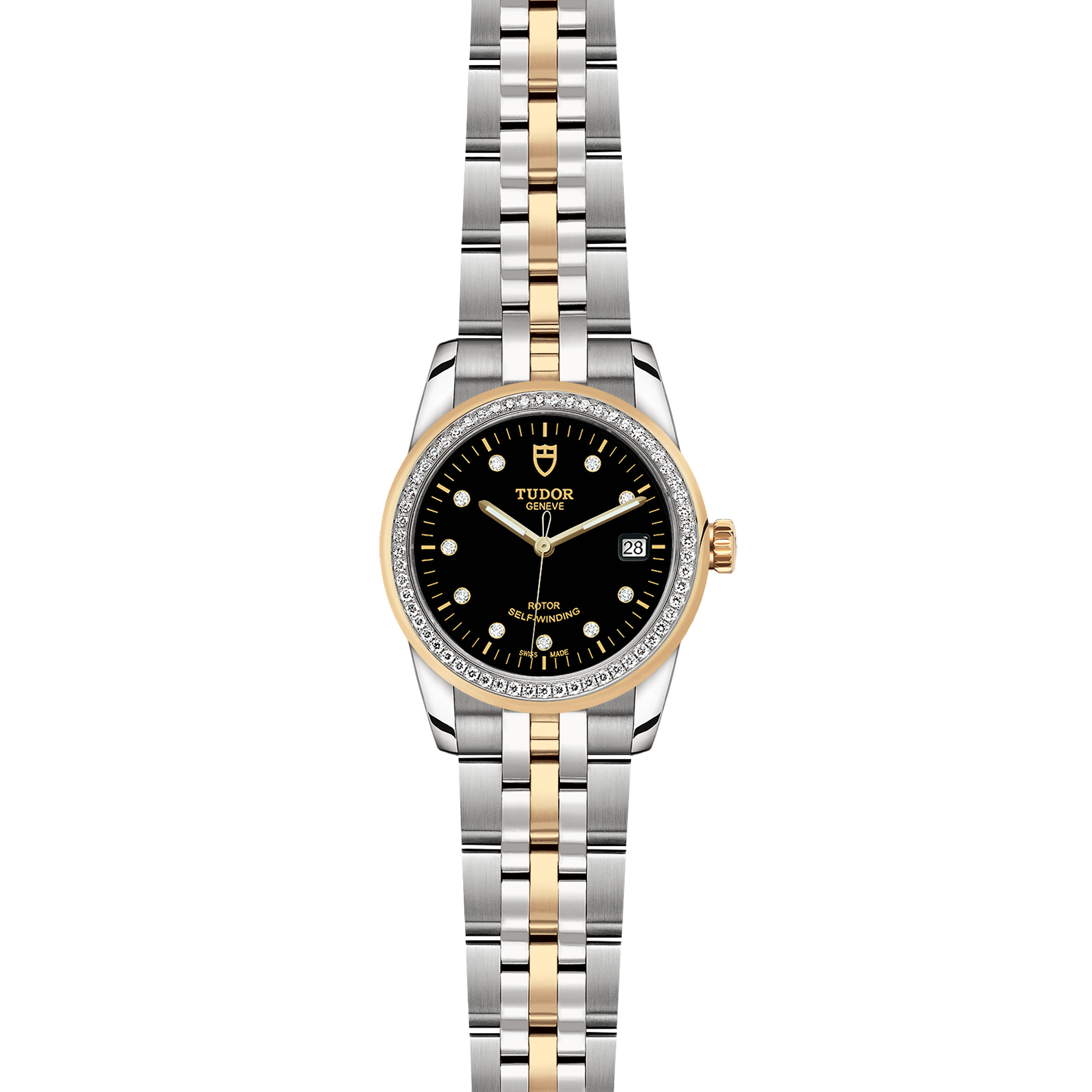 位於6點鐘及12點鐘位置的首節中間鏈節由實心黃金製成;其餘中間鏈節由精鋼或鋼芯及0.2毫米黃金包金製成;摺扣及保險扣
