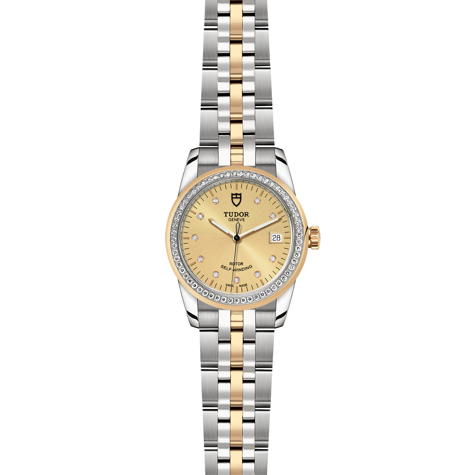 位於6點鐘及12點鐘位置的首節中間鏈節由實心黃金製成;其餘中間鏈節由精鋼或鋼芯及0.2毫米黃金包金製成;摺扣及保險扣