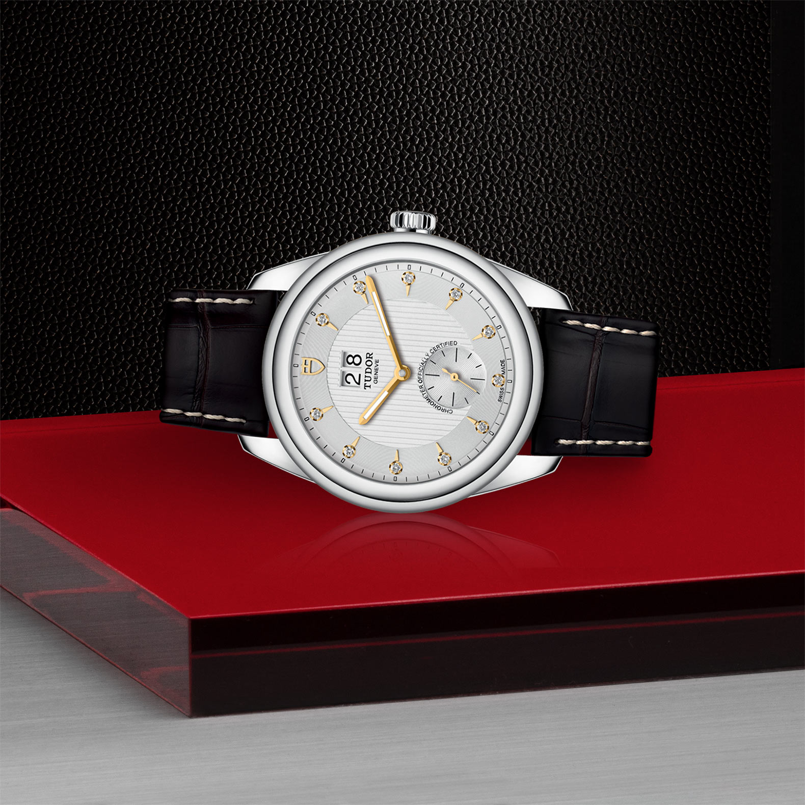 銀色配鍍黃金鐘點標記,鑲11顆鑽石