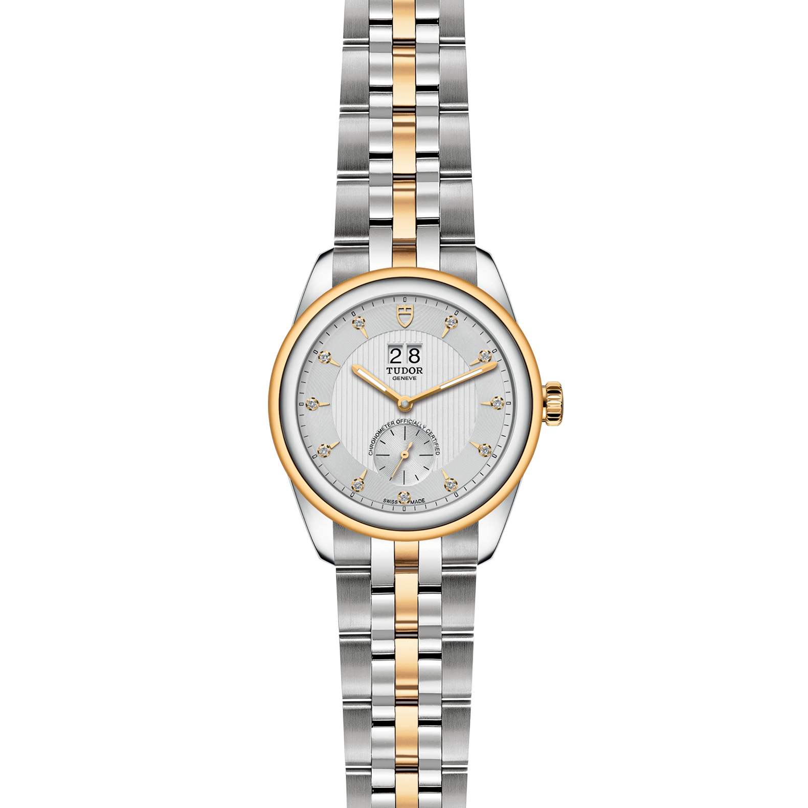 銀色配鍍黃金鐘點標記,鑲11顆鑽石